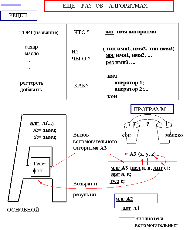Житейским примером, который может быть использован для пояснения способа записи алгоритма, является любой кулинарный рецепт - как приготовить определенное блюдо (что) из определенных продуктов (из чего)? Аналогия полная. Имя алгоритма - это название производимого продукта. Если алгоритм пишется для ЭВМ, то его часто так и называют - программный продукт. Указание типов имен, являющихся аргументами (входами) и результатами (выходами) алгоритма - это задание конкретных характеристик величин, для обработки которых предназначен алгоритм.