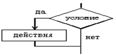 Базовая структура "ветвление". Определяет выполнение действий в зависимости от выполнения условия. Каждый из путей ведет к общему выходу, так что работа алгоритма будет продолжаться независимо от того, какой путь будет выбран.