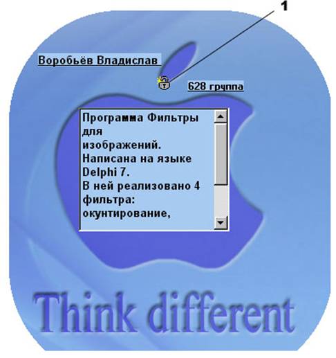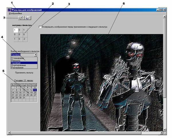При запуске программы перед вами предстает общий вид меню (см.рисунок 1), где можно выбрать 3 пункта(3 прозрачных кнопки). В первом пункте Help(см. рисунок 2) – находится краткая постановка задачи и информация об авторе, выход осуществляется по нажатию клавиши 1 прозрачная кнопка с замочком). С помощью пункта 2 (прозрачная кнопка 2) вы закройте данную программу. В пункте 3 (см. рисунок 3) - находится основное задание программы. С помощью основного меню 1 можно загрузить изображение в bmp формате, сохранить изображение, те же самые операции можно проделать с помощью панели инструментов 7, при загрузке изображения можно менять матрицу фильтра редактируя строки и столбцы данной матрицы 2, выбор фильтров таких как: сглаживание, резкость, тиснение, размывание, окунтирование можно осуществлять с помощью “вываливающейся” строки 4, можно приприменении очередного фильтра каждый раз возвращать изображение к исходному, поставив галочку 3. При необходимости можно применять несколько фильтров друг на друга, как бы накладывая их друг на друга, при этом необходимо убрать галочку 3, на рисунке как раз показано изображение после накладки двух фильтров тиснения и резкости, причем несколько раз(см. пункт 6). Для большей привлекательности программы добавлен наглядный календарь на текущей месяц 7 и вывод даты.