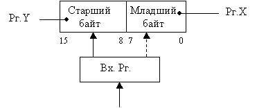 Сначала записывается во входной регистр старший байт, затем он пересылается в регистр Y. Потом записывается во входной регистр младший байт. И он пересылается в регистр Х.
