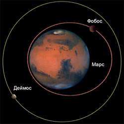 Изображения Фобоса и Деймоса показывают, что эти тела имеют неправильную форму, которая приблизительно может быть аппроксимирована эллипсоидом, размеры которого для Фобоса составляют 13,3х11,1х9,3 км, для Деймоса - 7,5х6,2х5,4 км. Большая ось эллипсоидов для обоих спутников направлена на Марс, и оба спутника вокруг Марса вращаются синхронно. Орбиты спутников практически круговые с радиус-вектором 9.378 км и 23.459 км для Фобоса и Деймоса соответственно. Плоскости орбит обоих спутников близки к экваториальной плоскости Марса и наклонены под углом 2,70 к ней. Период обращения Фобоса вокруг Марса 7 ч. 39 мин., для Деймоса 30 ч. 21 мин.