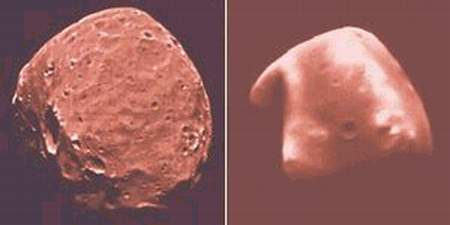 Поверхности обоих спутников кратерированы, однако, топографически они сильно отличаются. Фобос имеет множество глубоких почти прямых параллельных борозд шириной 100-200 м и глубиной 10-20 м. Некоторые из этих полос имеют длину до 30 км. Почти все эти протяженные полосы начинаются вблизи самого большого кратера на Фобосе - Стикни, диаметр которого 10 км, что составляет более одной трети диаметра Фобоса. Подобных полос на Деймосе нет. Кратеры там много меньше, чем на Фобосе (диаметр самого большого кратера на Деймосе - 2 км). Основной крупномасштабной морфологической особенностью поверхности Деймоса является его кажущаяся однородность. Наиболее загадочный вопрос, касающийся морфологических особенностей этих двух спутников, - почему поверхности их так сильно различаются?
