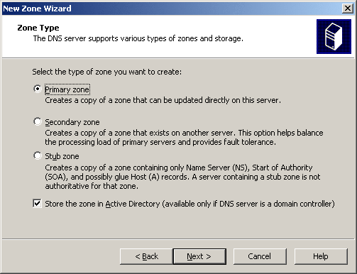 Для наших нужд потребуется первичная зона (primary zone), поскольку мы желаем полностью обслуживать локальную сеть этим DNS-сервером. Важно выбрать опцию интеграции с Active Directory в нижней части окна