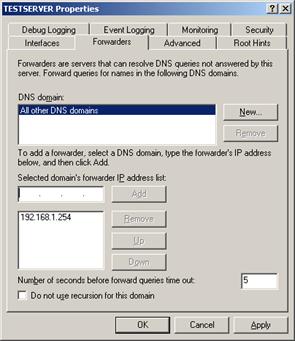 Для простоты мы просто ввели IP-адрес нашего DSL-маршрутизатора в качестве DNS forwarder. Наш сервер будет автоматически перенаправлять запросы к серверу DNS провайдера.