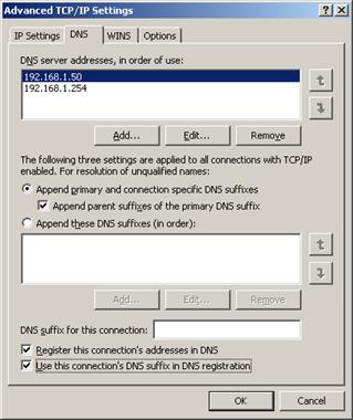 Сейчас необходимо отрегулировать настройки TCP/IP, чтобы сервер мог работать в паре с новым сервером DNS. На этот раз в качестве основного сервера DNS мы введём IP-адрес 192.168.1.50. Мы отметили все галочки, поскольку тоже хотим работать с суффиксами DNS.