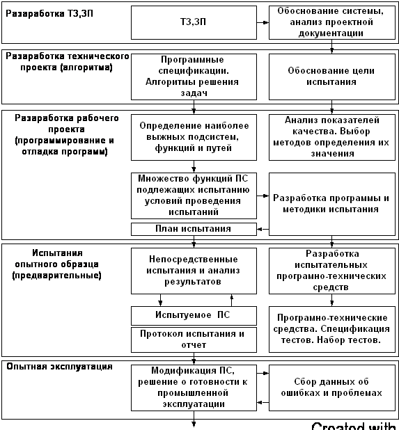 На рис. 16 изображена технологическая схема в виде этапов подготовки и проведения испытания и их связи с этапами разработки ПС.