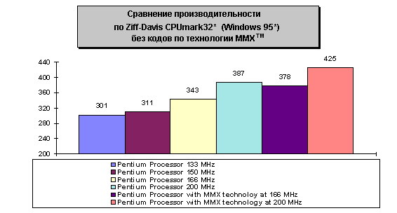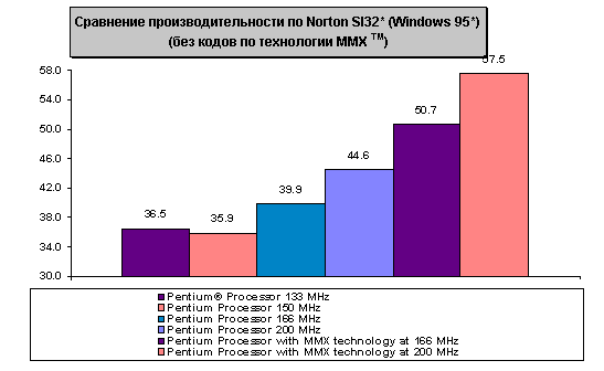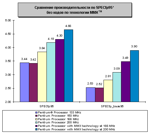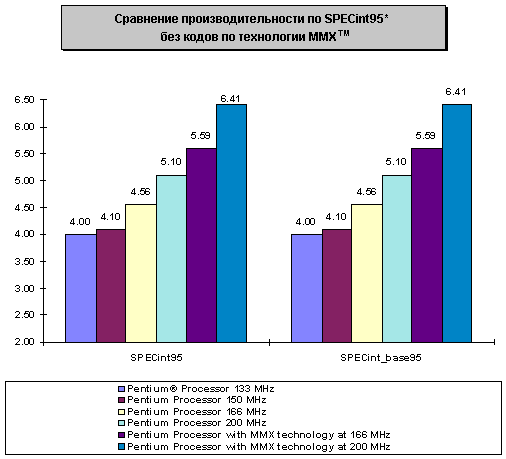 Так как подавляющее количество современных коммерческих приложений создано на основе программ, использующих интенсивные целочисленные вычисления, то смесь инструкций, используемая SPECint95, в наибольшей степени подходит для коммерческих приложений и, таким образом, является существенно более эффективным эталонным тестом, чем SPECfp95, для предсказания производительности процессора при работе с 32-разрядными приложениями для сферы бизнеса. На SPECint95 производительность разработанного Intel процессора Pentium с технологией MMX и тактовой частотой 200 МГц оказалась на 26 % выше, чем производительность такого же процессора, но без технологии MMX. Данные о производительности приведены на нижеследующих рисунках. Рисунки 3 и 4 показывают производительности процессоров на тестах SPECint95 и SPECfp95, когда в конфигурациях присутствует кэш второго уровня («кэш L2») объемом 512 Кб.