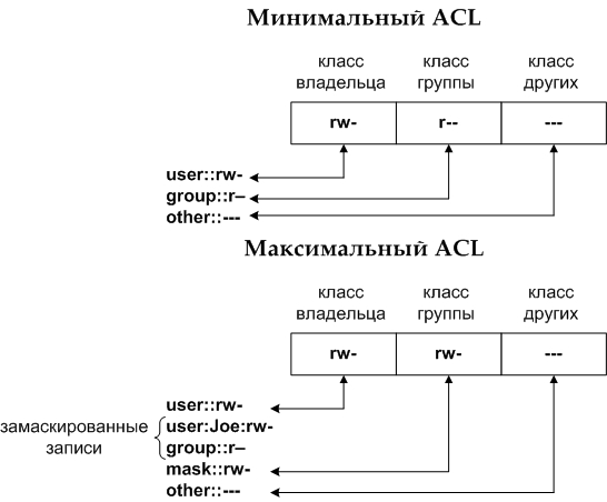 ACL, эквивалентный файловым битам доступа, называется минимальным ACL. Он состоит из трех записей. ACL с более чем тремя записями называется расширенным ACL. Расширенные ACL также содержат запись-маску и могут содержать любое (ограничивается конкретной реализацией ACL для конкретной файловой системы, где существует ограничение на максимальное число записей в одном ACL) количество записей для имеющихся пользователей и групп.