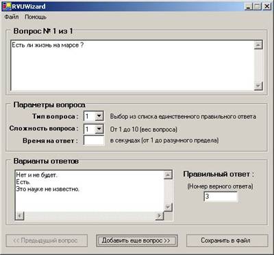 Для добавления в систему нового теста (группы вопросов) необходимо создать текстовый файл в формате РВУ (формат описан выше). При желании можно воспользоваться программой «RVUWizard_v.1.1», дистрибутив которой можно найти на сайте ЦИМПО в разделе «Полезные ресурсы» (http://212.192.35.213/cimes/resources/). Пример работы программы «RVUWizard_v.1.1» на рис. 9.