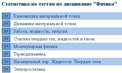 В меню администратора в разделе «Статистика» выбрать пункт «По тестам». На выбор будет предложено несколько дисциплин (предметов) как на рис. 11.