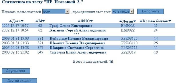 Далее нужно выбрать один из предложенных тестов. Появится список пользователей, проходивших выбранный тест, дата прохождения, количество баллов, логин и номер пользователя (рис. 13).