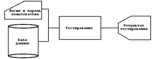 Из рисунка 2 видна общая декомпозиция задачи на модули. Рассмотрим систему тестирования пользователя. При входе в систему пользователь вводит свой логин и пароль. По этим данным из базы данных необходимо получить уникальный номер пользователя (Id), этот номер, в свою очередь, будет передан тестирующему модулю системы вместе с уникальным номером теста (Test_Un), запрошенного пользователем. Отображать вопросы (задачи) теста будем дозировано, т.е. по одной задаче за раз.