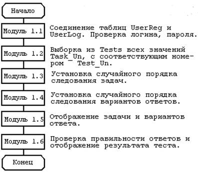 Подсистема тестирования может быть разбита на несколько основных этапов - модулей, реализуемых средствами СУБД (запросы, отчеты). Блок-схема алгоритма подсистемы тестирования приведена на рис. 4.