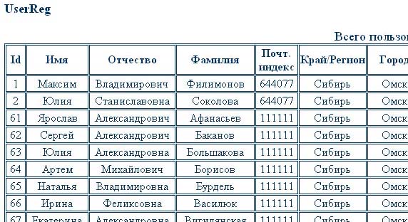 Выбрав пункт меню администратора «Посмотреть таблицу UserReg», можно посмотреть таблицу UserReg, в которой находятся все данные о пользователях: ФИО, адрес, e-mail, телефон и т.д. как на рис. 2.