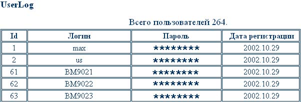 Выбрав пункт меню администратора «Посмотреть таблицу UserLog», можно посмотреть таблицу UserLog, в которой представлена информация о зарегистрированных пользователях: логин, пароль, дата регистрации как на рис. 3.