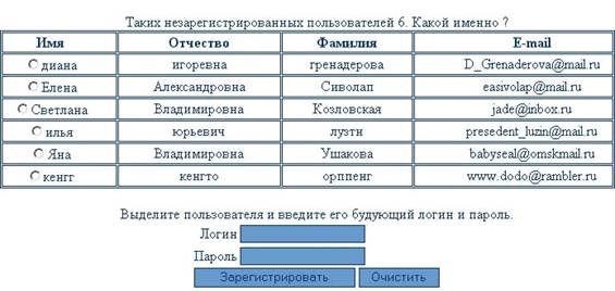 В приведенной форме можно ввести данные пользователя, чтобы его было легче найти, или оставить все поля пустыми. Нажимаем кнопку «Найти». Появится список всех (если поля формы остались пустыми) пользователей, которые в данный момент ожидают регистрации (рис. 5)