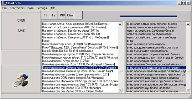 При запуске программы на экране монитора появляется форма с названием ”MainForm”. Это основное окно, которое отображается на экране с самого начала и не исчезает до завершения работы. Оно содержит такое средство управления как главное меню (Main Menu), которое состоит из следующих пунктов: “File”, ”Contractors”, ”Base”, ”Settings”, ”Help”. На рисунке представлен результат работы блока предварительной обработки строковых данных.