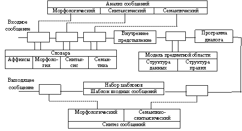 В процессе анализа сообщения пользователя выделяются корни слов, идентифицируется совокупность корней по словарю, хранящемуся в рабочей памяти, проводится морфологический разбор и после семантического разбора порождается сообщение на метаязыке системы.