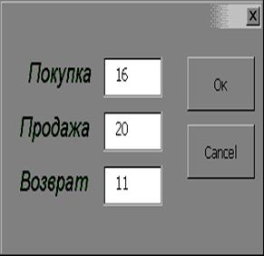 Вводим исходные значения , т.е. значения покупки продавцом журналов, продажи этих журналов и возврата в типографию в случае не реализации товара. Ввод всего этого производится в диалоговом окне, которое создается как UserForm со специальными кнопками и полями ввода покупки журналов, продажи, и возврата к типографию. Окно ввода выглядит так: