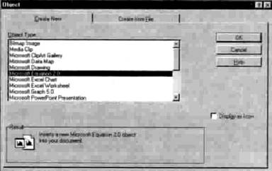 Для запуска Редактора формул из WinWord 7.0 необходимо установить курсор ввода в том месте документа, где должна быть вставлена формула. Затем следует вызвать команду Object… (Объект) из меню Insert, в разделе CreateNew (Создать новый) открывшегося диалогового окна, в списке ObjectType (Тип объекта) выполнить щелчок на элементе MicrosoftEquation 2.0 и нажать кнопку OK.
