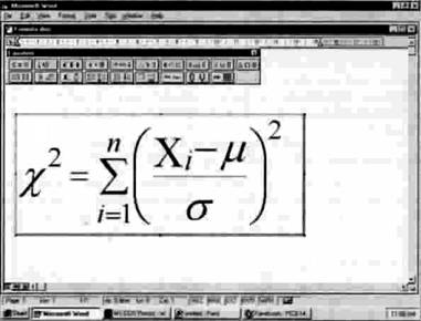 В поле объекта следует ввести прописную греческую литеру Х. Это можно сделать с помощью клавиатуры, нажав клавиши [Ctrl+G], а затем – [Shift+C], или с помощью мыши: крайнее справа поле в меню символов содержит прописные греческие литеры (искомая литера Х – третья в первом ряду). В качестве индекса вводится путем нажатия соответствующей клавиши на клавиатуре латинская литера "i". После этого курсор ввода следует установить в следующей позиции и ввести минус. Затем надлежит ввести строчную греческую литеру μ, а в знаменателе – строчную греческую литеру σ. Последним вводится верхний индекс над выражением в скобках – цифра 2.