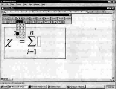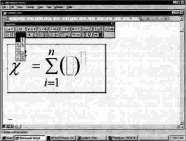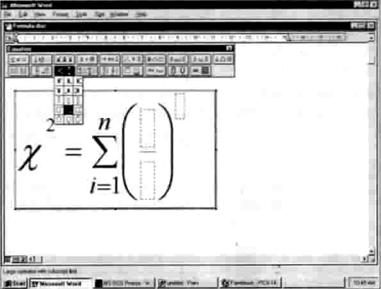 В качестве верхнего индекса нужно ввести цифру 2. Для этого следует позиционировать курсор ввода в поле верхнего индекса (с помощью мыши или клавиш управления курсором) и нажать клавишу с цифрой 2. Справа от введенных символов должен находится знак равенства "=". Чтобы ввести его, надлежит установить курсор ввода справа от введенных символов и нажать клавишу с символом "=". Далее в формуле стоит знак суммы с верхним и нижним индексами. Знаки суммы сосредоточены в четвертом слева поле меню шаблонов. Необходимо выбрать крайний справа знак в первом ряду (см. рис. 7).