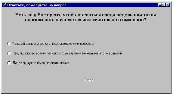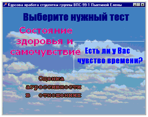 Здесь, на фоне неба как-бы «висят» названия тестов. При движении курсора мышки по кнопке, она приподнимается над общим фоном, как показано на рис. 1.1 Щелкнув левой кнопкой мыши, тестируемый выбирает интересующий его тест и попадает в окно тестирования, показанное на рис. 1. 2, стр. 10. Чтобы ответить на вопрос, достаточно щелкнуть на правильном с точки зрения пользователя варианте ответа (при этом все варианты тут-же заблокируются и станет доступной кнопка «Далее»). Для перехода к следующему вопросу надо нажать кнопку «Далее».
