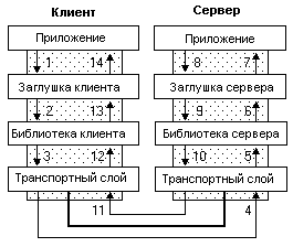 Как показано на рис.2.3, клиентское приложение вызывает локальную заглушку вместо кода, непосредственно реализующего необходимую процедуру. Заглушка компилируется и линкуется с клиентским приложением. Заглушка клиента выполняет следующие действия: