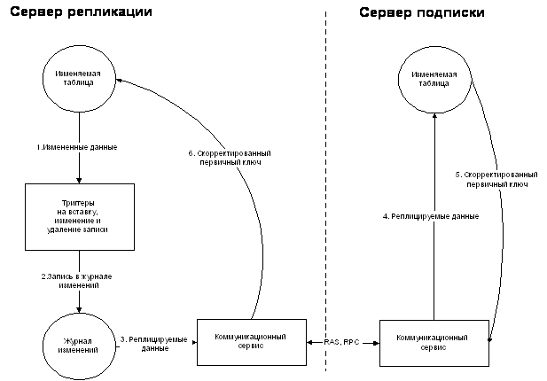 Схема репликации приведена на рис.2.7. Рассмотрим процесс передачи изменений подробнее: