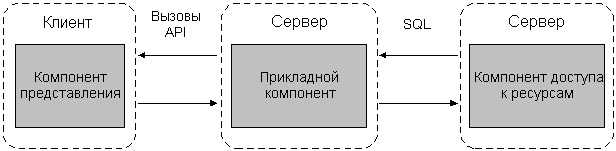 В AS-модели процесс, выполняющийся на компьютере-клиенте, отвечает, как обычно, за интерфейс с пользователем (то есть реализует функции первой группы). Обращаясь за выполнением услуг к прикладному компоненту, этот процесс играет роль клиента приложения (Application Client - AC). Прикладной компонент реализован как группа процессов, выполняющих прикладные функции и называется сервером приложения (Application Server - AS). Все операции над информационными ресурсами выполняются соответствующим компонентом, по отношению к которому AS играет роль клиента. Из прикладных компонентов доступны ресурсы различных типов - базы данных, очереди, почтовые службы и др.