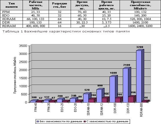 Рис.4.1 Максимально достижимая пропускная способность основных типов памяти при наличии зависимости по данным и при отсутствии таковой.