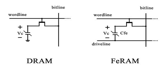 Ячейка ферроэлектрической памяти похожа на 1T/1C ячейку DRAM. Единственное отличие заключается в том, что в DRAM одна из обкладок конденсатора заземлена, а в FeRAM она подключена к передающей линии (driveline).