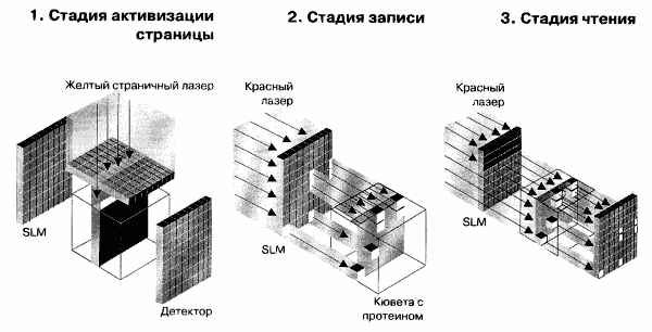 При записи данных сначала надо зажечь желтый "страничный" лазер - для перевода молекул в Q-состояние. Пространственный световой модулятор (SLM), который, как говорилось ранее, представляет собой LCD-матрицу, создающую маску на пути луча, вызывает возникновение активной (возбужденной) плоскости в материале внутри кюветы. Эта энергоактивная плоскость представляет собой страницу данных, которая может вмешать массив 4096x4096 bit. Перед возвратом протеина в состояние покоя (в нем он может находиться довольно длительное время, сохраняя информацию) зажигается красный, записывающий лазер, располагаемый под прямым углом по отношению к желтому. Другой SLM отображает двоичные данные и, таким образом, создает на пути луча соответствующую маску, поэтому облучению подвергнутся только определенные пятна (точки) страницы. Молекулы в этих местах перейдут в Q-состояние и будут представлять двоичную единицу. Оставшаяся часть страницы возвратится в первоначальное bR-состояние и будет представлять двоичные нули. Для того, чтобы прочитать данные, надо опять зажечь страничный лазер, который переводит читаемую страницу в Q-состояние. Это делается для того, чтобы в дальнейшем, с помощью различия в спектрах поглощения, идентифицировать двоичные нули и единицы. Через 2ms после этого страница "окунается" в низкоинтенсивный световой поток красного лазера. Низкая интенсивность нужна для того, чтобы предупредить "перепрыгивание" молекул в Q-состояние. Молекулы, представляющие двоичный нуль, поглощают красный свет, а представляющие двоичную единицу пропускают луч мимо себя. Это создает "шахматный" рисунок из светлых и темных пятен на LCD-матрице, которая захватывает страницу цифровой информации.