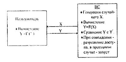 При входе пользователя в ВС системой защиты генерируется случайное число или случайная последовательность символов X и вычисляется функция F(X), заданная для данного пользователя (см. Рис. 1.2). Далее X выводится пользователю, который должен вычислить F(X) и ввести полученное значение в систему. Значения F(X) и F(X) сравниваются системой и если они совпадают, то пользователь получает доступ в ВС.
