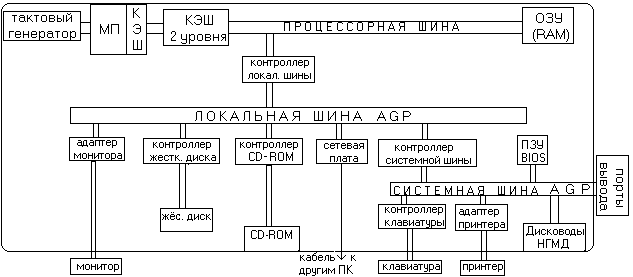 Если снять корпус системного блока и посмотреть внутрь, то можно увидеть детали, соответствующее следующей схеме архитектуры ПК: