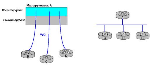 Примечание - По определению IP-сети, каждый узел в ней может связаться с каждым без помощи промежуточного маршрутизатора. Фактически, полную связность можно реализовать только при полносвязной структуре PVC, где каждый маршрутизатор соединен с каждым. В данном примере маршрутизаторы B,C,D не смогут связаться друг с другом непосредственно.