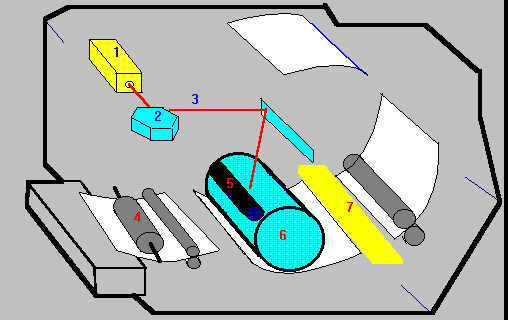 Малогабаритный лазер генерирует тонкий световой луч, отражающийся от вращающегося зеркала (как правило, шестигранного) разряжает положительно заряженную поверхность барабана. Чтобы получилось изображение, лазер включается и выключается управляющим микроконтроллером. Вращающееся зеркало разворачивает луч в строку на поверхности печатающего барабана. Все это вместе создает на его поверхности строку скрытого изображения, в котором те участки, которые должны быть черными, имеют один заряд, а белые противоположный. После формирования строки изображения, специальный презиционный шаговый двигатель поворачивает барабан так, чтобы можно было формировать следующую строку. Это смещение равняется разрешающей способности принтера и обычно составляет 1/300,1/600 дюйма . Этот этап печати напоминает построение изображения на экране телевизионного монитора.