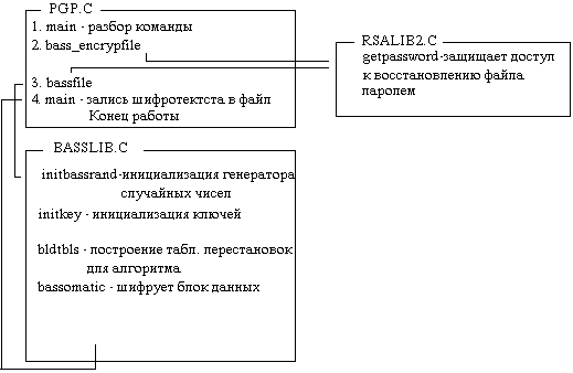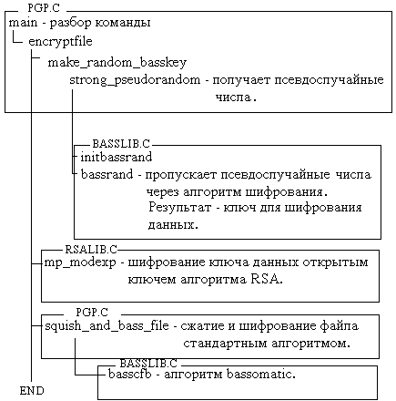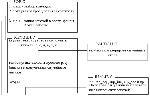 Головной модуль pgp.c обеспечивает интерфейс системы с пользователем и взаимодействие ее компонентов. Входящая в него функция main() производит разбор командной строки, через которую пользователь указывает команду. В соответствии с командой main() производит последовательный вызов необходимых подпрограмм, обеспечивая их согласованную работу.