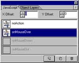 IS поддерживает автоматическую генерацию кода JavaScript при экспорте HTML документа. При помощи него можно создать простейшую анимацию на web-страничке: при нажатии кнопки мыши на картинку, проведении курсора над ней, картинка может изменять вид. Для этого существует палитра JavaScript, о которой уже упоминалось раньше. Теперь рассмотрим ее более детально: