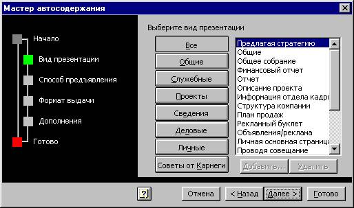 Наверное, среди предлагаемых в окне шаблонов вы сможете подобрать нужный. Если же все-таки подходящей темы не нашлось, нажмите кнопку Добавить или Все, чтобы получить список всех шаблонов презентаций. После выбора шаблона презентации (например, Финансовый отчет компании) и нажатия кнопки Далее вы попадете в окно мастера автосодержания, в котором необходимо выбрать способ демонстрации презентации. Если вы планируете проводить презентацию самостоятельно, оставьте включенной опцию Доклады, совещания, выдачи. Если материалы будут опубликованы и затем продемонстрированы без вашего участия, выберите опцию Интернет, киоск. Киоском в PowerPoint 97 называют место, где презентация демонстрируется без участия пользователя (например, рекламный стенд или витрина магазина).