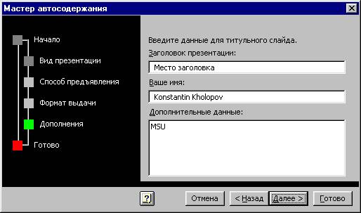В следующем диалоговом окне мастера автосодержания необходимо определить форму выдачи материалов (слайды, черно-белые или цветные прозрачки, презентация на экране компьютера) и указать, нужен ли раздаточный материал при проведении презентации. Кроме того, надлежит ввести данные о себе: название фирмы, какой-либо девиз и т.п. Эта информация будет размещена на титульном слайде презентации.