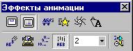 Панель инструментов Эффекты анимации открывается в результате выполнения щелчка на одноименной кнопке панели инструментов Форматирование или вследствие активизации одноименной команды в контекстном меню панелей инструментов. Инструменты панели Эффекты анимации описаны в следующей таблице.