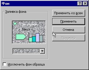Чтобы фон слайда принял другой вид, можно изменить его цвет, оттенение, узор или текстуру. Кроме того, в качестве фона можно использовать какой-либо рисунок. При этом следует учитывать, что на слайде или в образце допускается только один вид фона. Например, фон выполняется в виде оттенения, текстуры или рисунка, но на любом отдельно взятом слайде используется только один из этих вариантов. Изменение, вносимое в фон, применяется только к текущему слайду или ко всем слайдам и образцу.