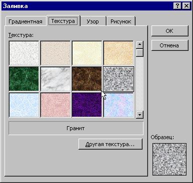 2 В группе Заливка фона щелкните стрелку вниз, затем щелкните Способы заливки и перейдите на вкладку Текстура.