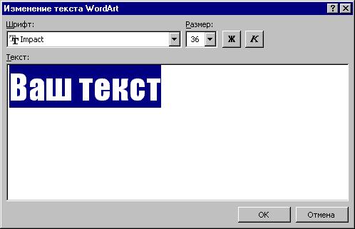 Запуск программы Microsoft WordArt для создания текстового эффекта Открытие окна Изменение текста WordArt(текст можно ввести непосредственно в это окно или вставить из буфера обмена с помощью клавиш [Ctrl-V]) Открытие диалогового окна Коллекция WordArt для выбора стиля текста Открытие стандартного окна форматирования объектов ,предназначенного для установки параметров линий ,цвета , положения и обтекания Выбор параметров контура объекта WordArt После щелчка на этой кнопке рядом с объектом WordArt появляются зеленые маркеры вращения , с помощью которых можно повернуть выделенный объект на произвольный угол Установка одинаковой высоты для всех букв в выделенном объекте WordArt Расположение символов один под другим (при этом текст читается сверху вниз) Выбор способа выравнивания текста по горизонтали Установка межсимвольного интервала и кернинга для объекта WordArt |