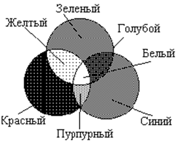 Это означает, что все цвета могут быть получены путем сложения трех основных цветов (синий, зеленый, красный), что позволило в цветных мониторах использовать метод аддитивного смешения цветов (Рис. 3.2.2.).