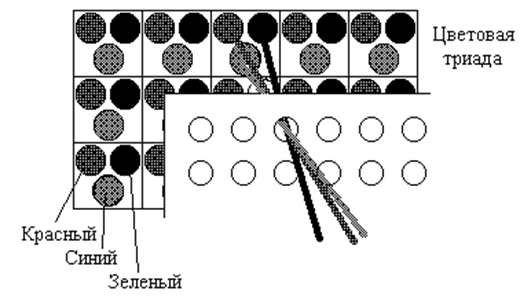 Если на изображении имеются близко расположенные цветные детали, то с большого расстояния мы не различим цвета отдельных деталей. Учитывая это свойство зрения, в электронно-лучевой трубке монитора формируется цвет одного элемента изображения из трех цветов люминофорных зерен, расположенных рядом. В соответствии с особенностями человеческого зрения в электронно-лучевой трубке цветного монитора имеются три лучевые пушки с отдельными схемами управления, а на внутреннюю поверхность экрана нанесен люминофор трех основных цветов (RGB) (Рис. 3.2.3.).