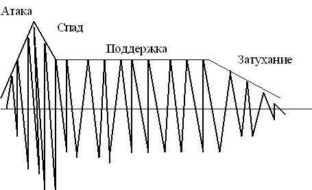 Принцип синтезирования заключается в воссоздании структуры музыкального тона (ноты) созданный с помощью музыкального инструмента звуковой сигнал, как правило, имеет несколько временных фаз: атака, поддержка и затухание (Рис. 4.1.5.).