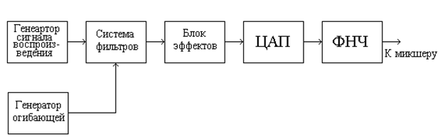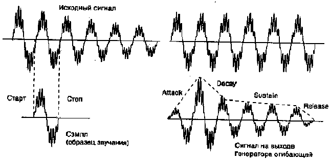 В общем случае технология создания звука (голоса инструмента) в современных синтезаторах заключается примерно в следующем (Рис. 4.1.6.).