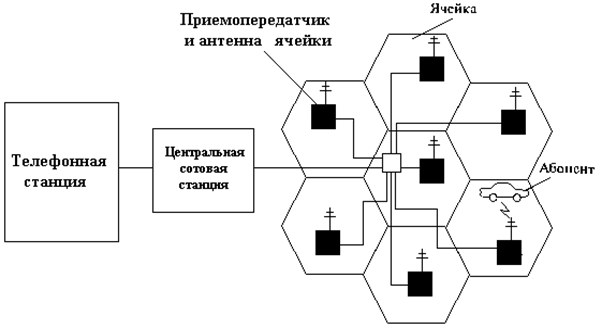 Сотовая связь коренным образом отличается от традиционной радиосвязи (Рис. 7.2.3.). В ней не предусматривается создание отдельных, требующих больших затрат энергии, каналов связи между каждой парой абонентов. Вместо этого обслуживаемая территория делится на относительно небольшие ячейки (соты). Станции, расположенные в каждой ячейке, имеют небольшую мощность, полностью автоматизированы, и каждая из них соединена с центральной сотовой станцией. Абоненты связываются не непосредственно с центральной, а только с ближайшей станцией. Таким образом, на большом пространстве может быть создана сеть из множества взаимосвязанных радиостанций.